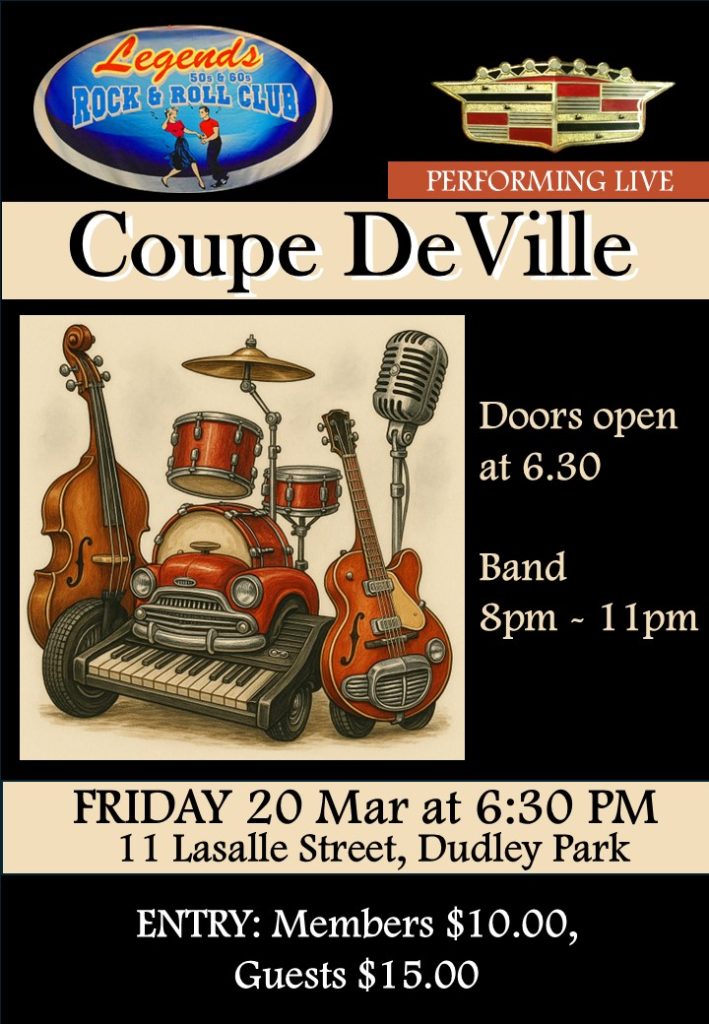 Legends Rock & Roll Club – 11 Lasalle Street, Dudley Park. Doors open at 6.30, Coupe DeVille – 8pm to 11pm